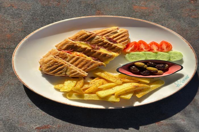 Ayvalık tost ekmeğinde taze kaşar, dana kavurma, patates cipsi ve söğüş ile ..